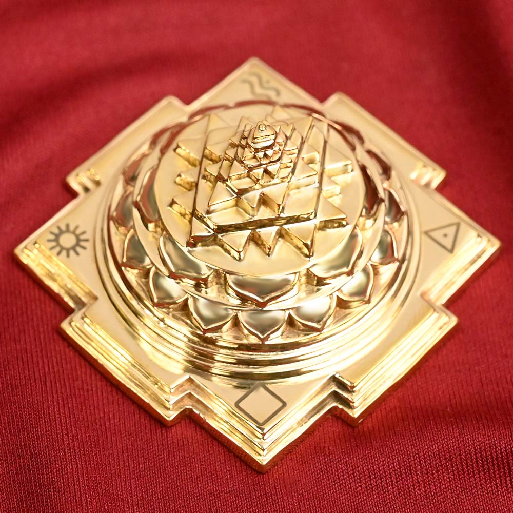The base of the Shri Yantra is inscribed with sacred geometric symbols—a square, circle, triangle, and waves—each representing the five elements: earth (prithvi), water (apas), fire (agni), air (vayu), and ether (akasha), signifying the yantra’s connection to the fundamental forces of creation.