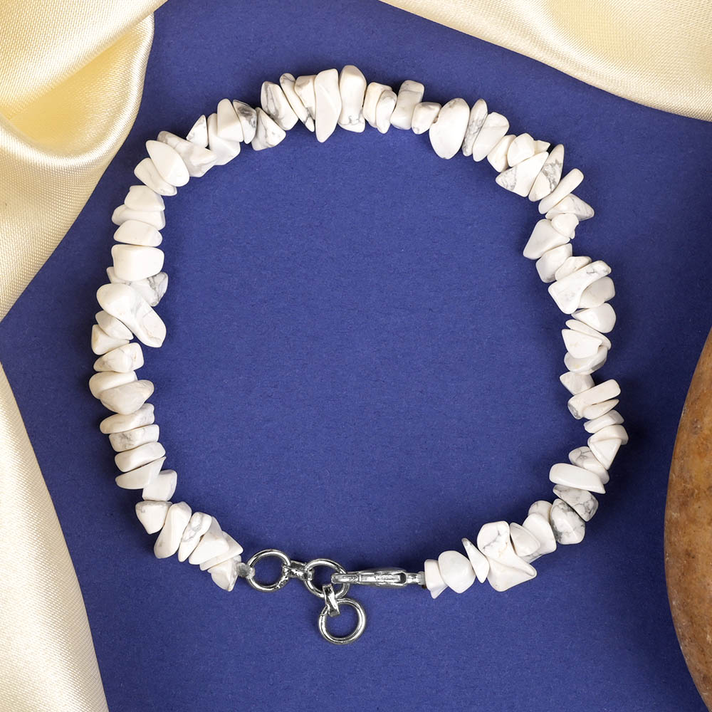 Gorgeous bracelet made of uncut Howlite stones strung in elastic thread. Howlite soothes the mind, eases stress, and nurtures patience and emotional balance. Perfect for daily wear as a distinctive accessory or during meditation and mantra chanting, it promotes serenity, sharpens focus, and invites positive energy.