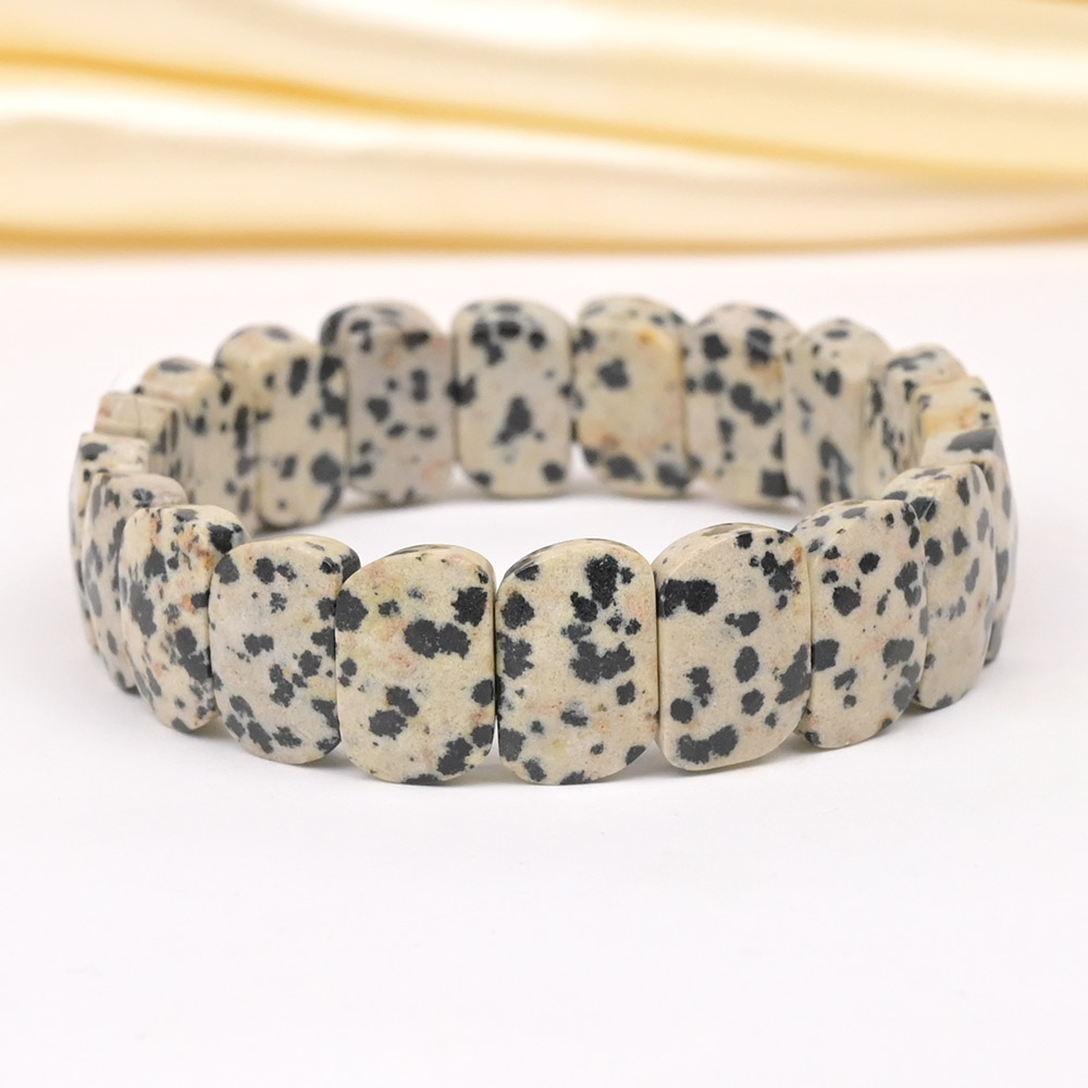 An attractive bracelet strung with smooth oval-shaped beads of natural Dalmatian Jasper on finest quality elastic. Dalmatian Jasper provides protection from negative energies, helps to overcome misfortune, bestows good luck, prosperity, provides courage, tolerance, confidence to face challenges, inspires to take action and aids in spiritual advancement.