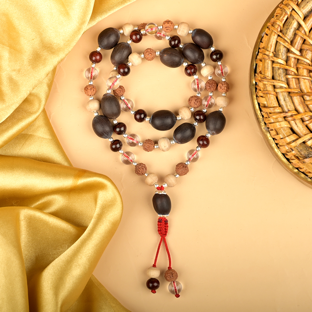 Crafted from natural beads representing the five sacred elements known as the Panch Bhoota in Bharat, this mala carries the energies of Earth, Water, Fire, Air, and Space in a single powerful combination strung with silver balls between the beads. The Panch Bhoota mala combines the auspicious energies of Sandalwood Red chandan, Lotus seed Thamarai Mani, Rudraksha, Quartz crystal Sphatik, and Tulsi beads. Each bead is selected for purity and strength, then assembled by traditional artisans to maintain elemental balance. The mala is suitable for daily wear, meditation, and mantra chanting, supporting grounding and spiritual expansion.