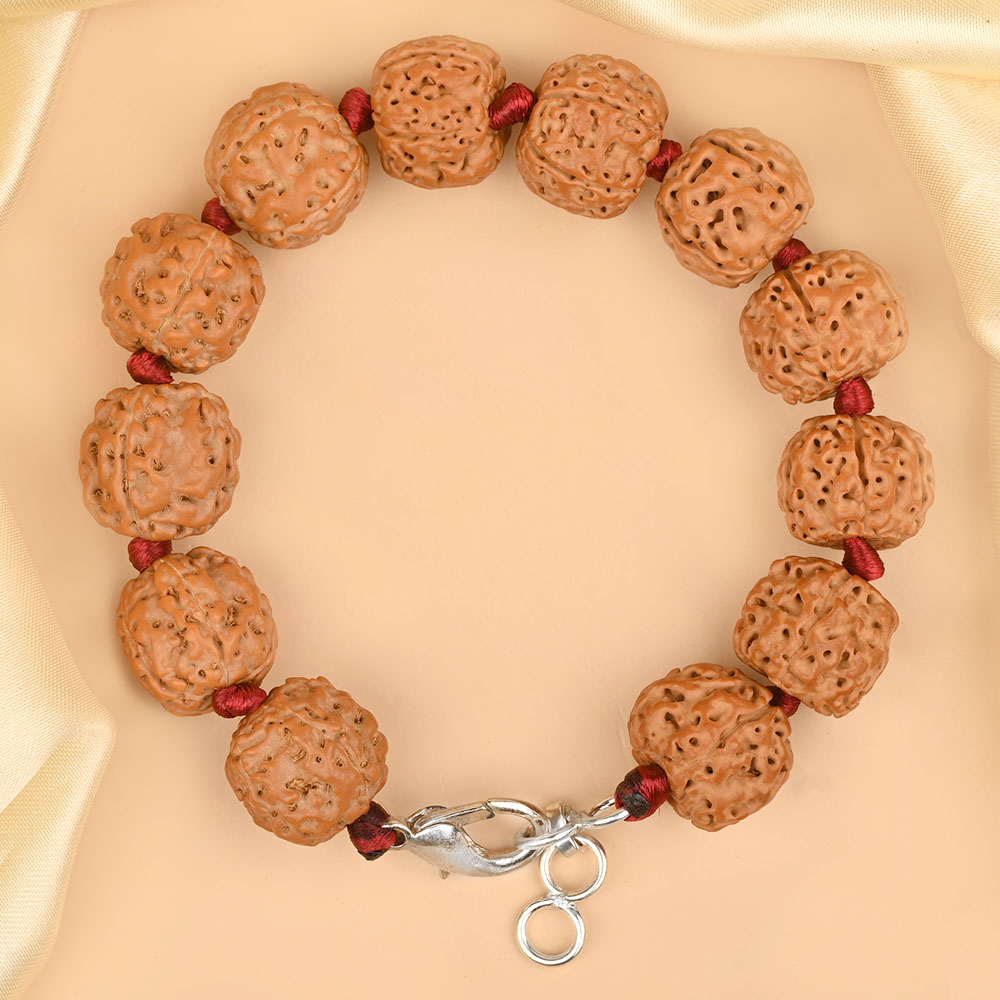 This bracelet is made with premium Java 5 Mukhi Rudraksha beads, neatly hand-knotted on a durable red thread for strength and flexibility. It is secured with a high-quality German silver hook clasp, offering both ease of wear and a refined look. Designed for daily wear, it supports both spiritual practices and overall well-being.