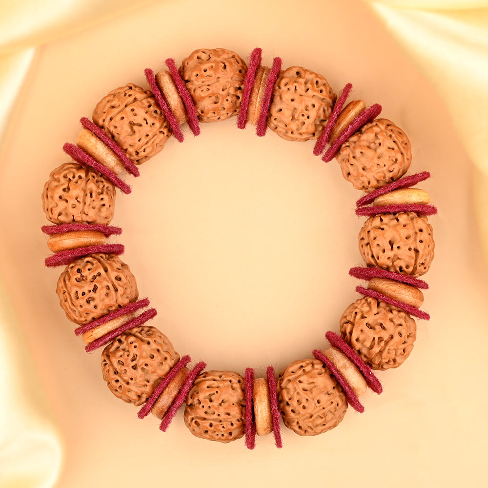 This bracelet is crafted using select Javanese 5 Mukhi Rudraksha beads interspaced with wood and wool spacers, offering a traditional yet comfortable design ideal for everyday spiritual alignment.