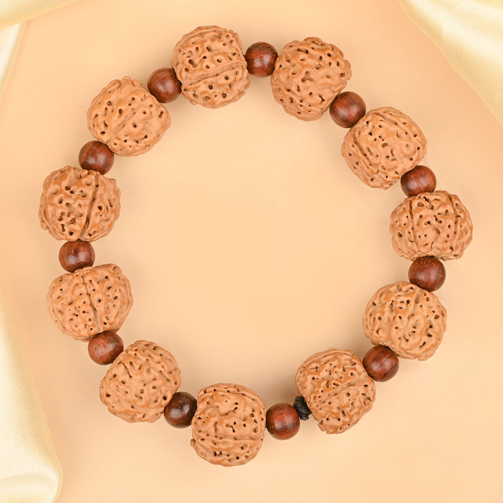The 5 Mukhi Rudraksha from Java is ruled by planet Jupiter, also known as Guru or Brihaspati. It awakens the Upaguru, the higher self within, and brings peace of mind, improved immunity, and emotional balance. It also helps heal the throat chakra, providing relief in hormonal and thyroid-related issues. Red Sandalwood calms the mind, enhances meditation, and keeps the wearer connected to inner peace. Designed with Rudraksha Ratna Chakra Therapy (RRCT), this bracelet supports personal transformation and spiritual growth.