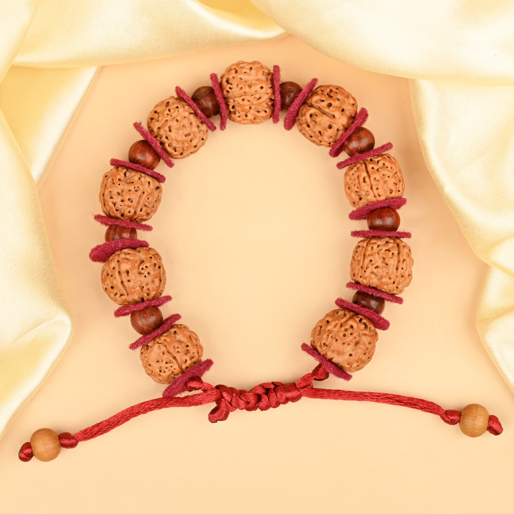 This sacred bracelet features a beautiful combination of Premium 5 Mukhi Rudraksha beads from Java and smooth Red Sandalwood beads. The Rudraksha beads are carefully chosen for their deep mukhi lines and strong natural form, while the Red Sandalwood beads bring a rich, earthy glow. Soft maroon woolen spacers between each bead offer comfort and a gentle fit. The bracelet is finished with a red adjustable thread and round beads for secure and flexible wearing.